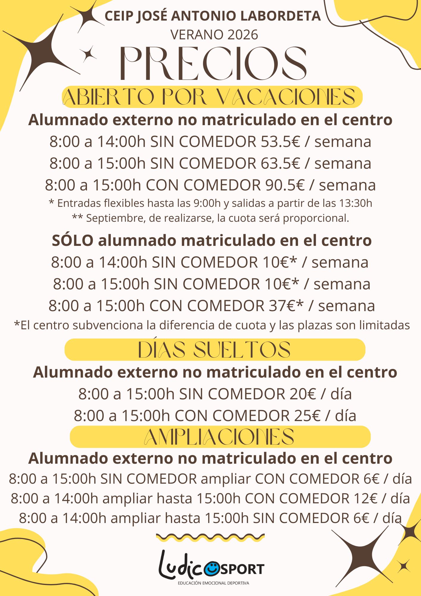 Las cuotas para alumnado matriculado en CEIP JOSÉ ANTONIO LABORDETA se encuentran subvencionadas parcialmente por el colegio quedando reducidas a 10€ por semana en todos los tramos EXCEPTO SERVICIO COMEDOR (las plazas son limitada y este importe lo abonarán todas las familias matriculadas en el centro a la hora de realizar la inscripción). El resto de alumnado externo no matriculado en el centro deberán abonar el importe completo detallado por tramo.