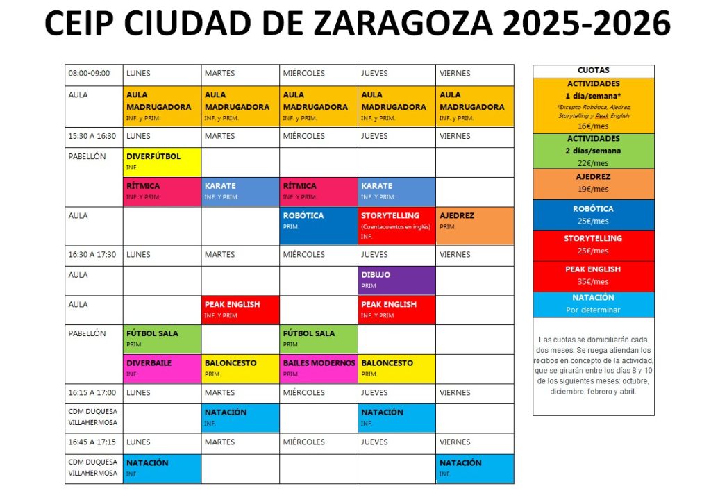 - CALENDARIO: Todas las actividades se desarrollan siguiendo el calendario escolar del Gobierno de Aragón. Las actividades extraescolares se imparten desde el primer día lectivo del mes de octubre hasta el último día lectivo del mes de mayo. En aquellos centros con servicio de Aula Madrugaodra/Madrugadores gestionados por Ludicosport se ofrecen desde el primer día de curso en septiembre hasta el último día de curso en junio. En el caso de Ludicotardes se ofertan durante la reducción de jornada escolar de los meses de septiembre y junio.