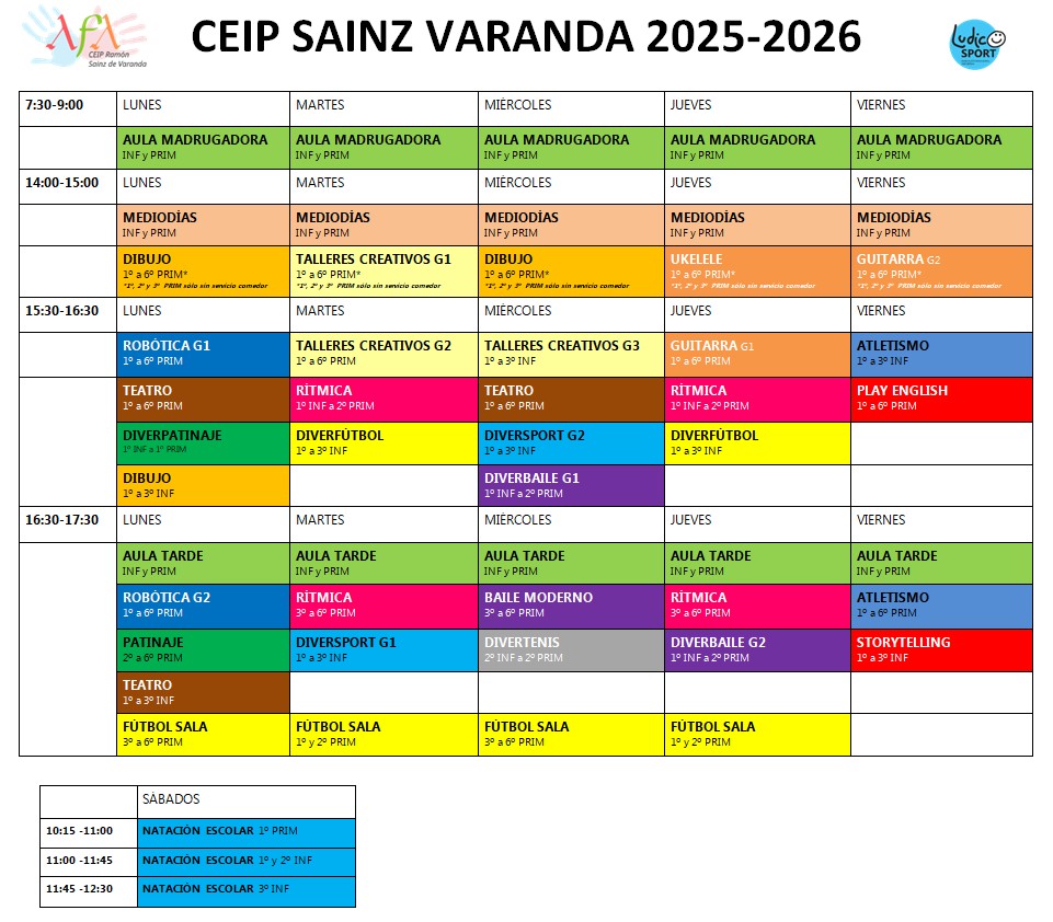 - CALENDARIO: Todas las actividades se desarrollan siguiendo el calendario escolar del Gobierno de Aragón. Las actividades extraescolares se imparten desde el primer día lectivo del mes de octubre hasta el último día lectivo del mes de mayo. En aquellos centros con servicio de Madrugadores gestionados por Ludicosport se ofrecen desde el primer día de curso en septiembre hasta el último día de curso en junio. En el caso de Ludicotardes se ofertan durante la reducción de jornada escolar de los meses de septiembre y junio.