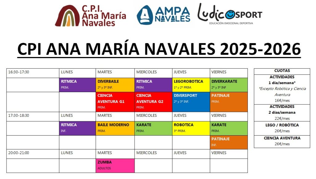 - CALENDARIO: Todas las actividades se desarrollan siguiendo el calendario escolar del Gobierno de Aragón. Las actividades extraescolares se imparten desde el primer día lectivo del mes de octubre hasta el último día lectivo del mes de mayo. En aquellos centros con servicio de Madrugadores y aula madrugadora gestionados por Ludicosport se ofrecen desde el primer día de curso en septiembre hasta el último día de curso en junio. En el caso de Ludicotardes se ofertan durante la reducción de jornada escolar de los meses de septiembre y junio.