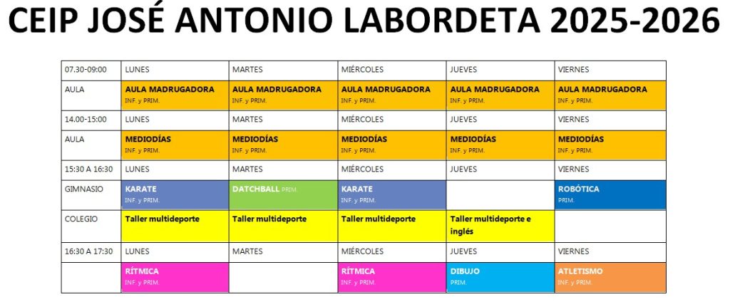 1. CALENDARIO: Todas las actividades se desarrollan siguiendo el calendario escolar del Gobierno de Aragón. Las actividades extraescolares se imparten desde el primer día lectivo del mes de octubre hasta el último día lectivo del mes de mayo. En aquellos centros con servicio de Aula Madrugaodra/Madrugadores gestionados por Ludicosport se ofrecen desde el primer día de curso en septiembre hasta el último día de curso en junio. En el caso de Ludicotardes se ofertan durante la reducción de jornada escolar de los meses de septiembre y junio.