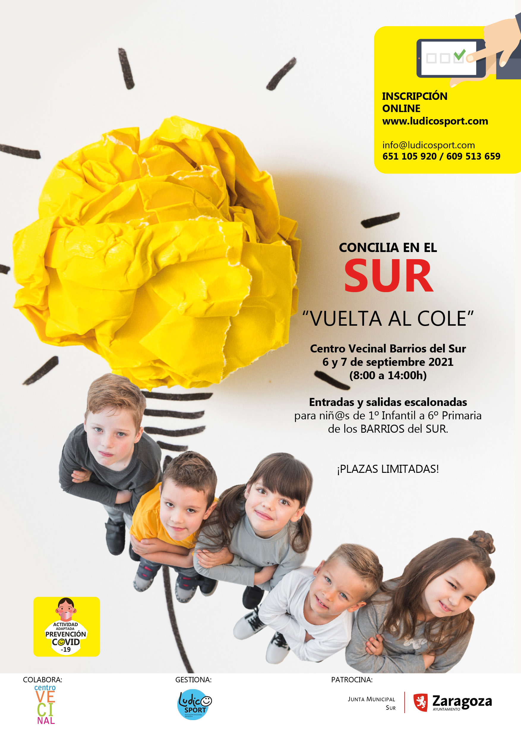 Regresa Concilia en el Sur los 2 últimos días de vacaciones de verano durante la primera semana del nuevo curso escolar de manera que los niñ@s puedan continuar con su desarrollo psico-físico integral conjugando la vida familiar y laboral de sus familias. En esta ocasión con 2 grupos de 3 a 12 años en el Centro Vecinal del barrio de Valdespartera. La intención continúa siendo alternar las ubicaciones por todos los barrios del Sur.