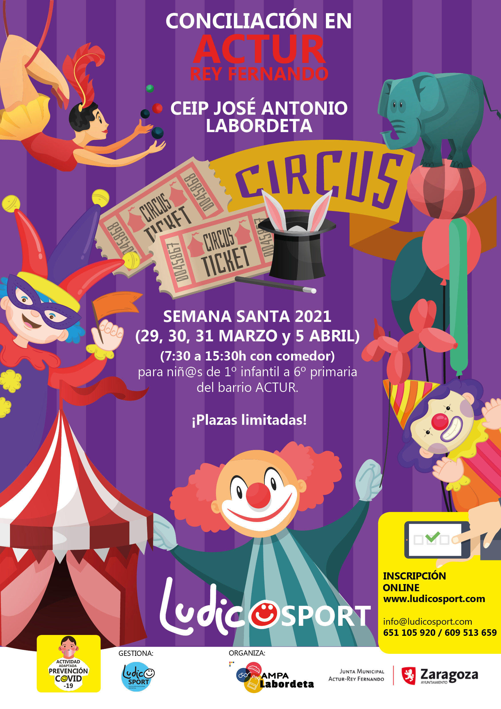 El servicio de CONCILIACIÓN EN ACTUR-REY FERNANDO «Circus» se ofrece durante las vacaciones escolares de Semana Santa de manera que los niñ@s puedan continuar con su desarrollo psico-físico integral conjugando la vida familiar y laboral de sus familia.